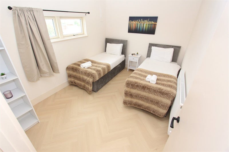 Wood flooring, white painted walls, spotlights, radiator, curtains, 2 single beds, bedside table, shelving unit