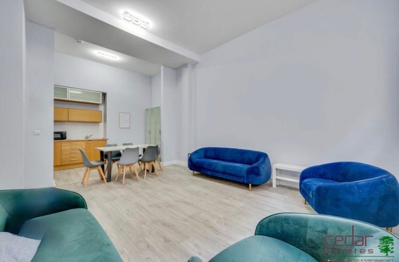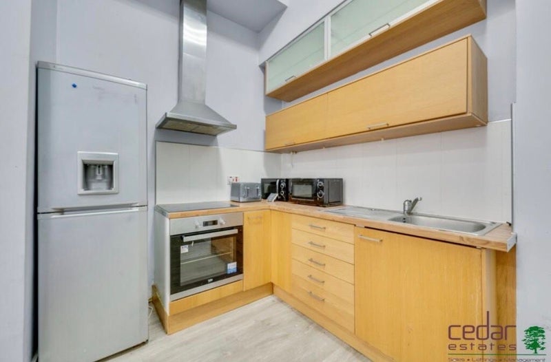 The flat features high ceilings, large windows, and wood flooring throughout, creating a light and airy feel. The open-plan kitchen and reception area provides a sociable hub of the home — ideal for relaxing or spending time together. The kitchen comes fully equipped with all essential appliances.