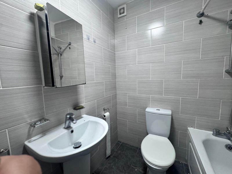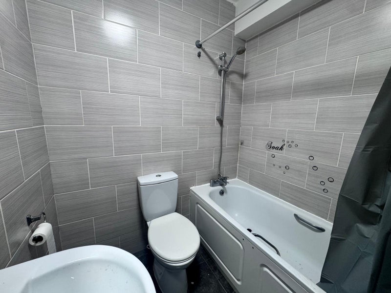 The property comprises a spacious eat-in kitchen, a well-proportioned bedroom, a modern family bathroom with bath and shower, and a separate living room, including a washing machine.
