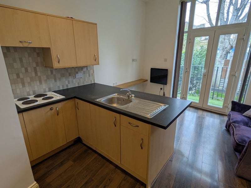 Set on the raised ground floor of an attractive period conversion, the property features a bright and well-proportioned studio room, a contemporary open-plan kitchen, and a separate shower room. A standout feature is the beautiful private balcony terrace—perfect for outdoor seating and entertaining.