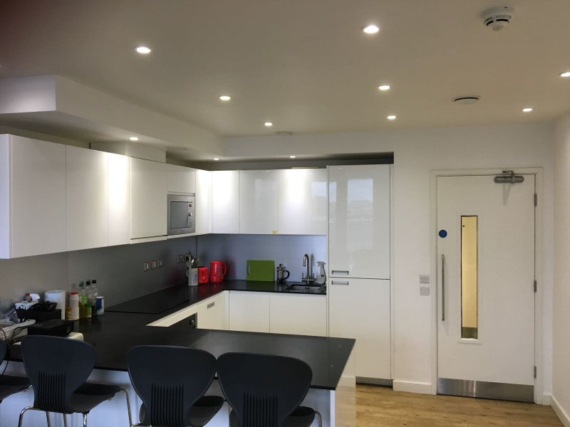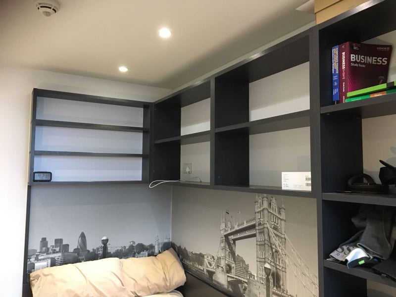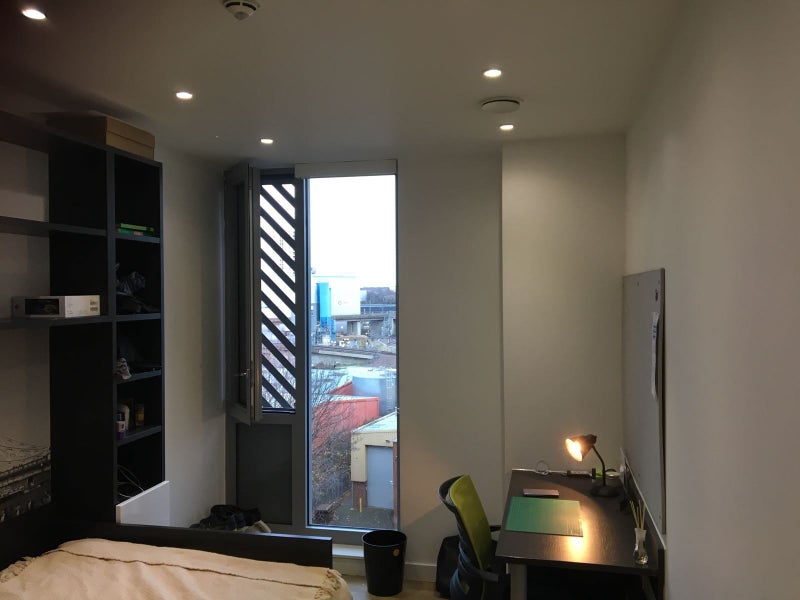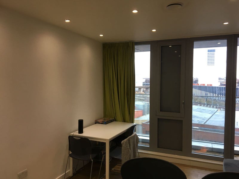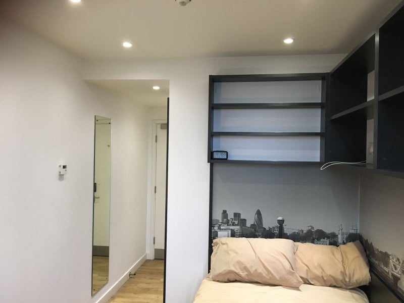 Ensuite room (memory foam mattress, built-in desk and desk chair, underfloor heating, wardrobe and a private shower room), shared kitchen (stainless steel appliances such as a ceramic hob, fridge/freezer, oven, microwave and a lounge area.), living room, and balcony at student accommodation. Great location between Camden and kings cross and amazing flatmates.