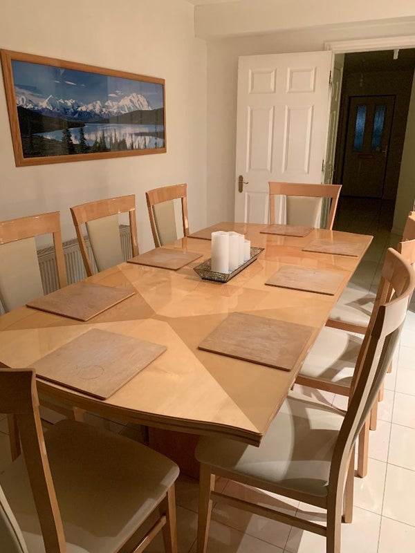 The property has an off-street driveway, integral garage and rear garden. The ground-floor is fully tiled with a long foyer entrance that leads to a fully equipped and fitted south-facing modern kitchen (with washing machine, tumble dryer) and an eight seater dining area that has a patio door entry to the rear garden. There is also a ground-floor toilet.