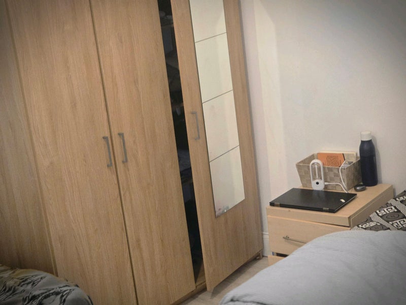 One bed one dresser one single cupboard and single sofa ..............