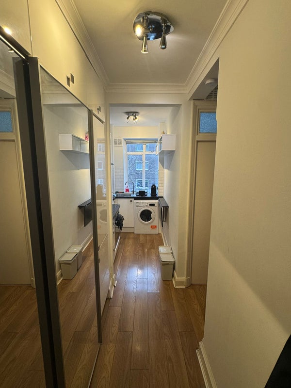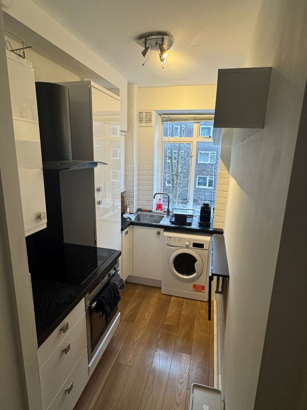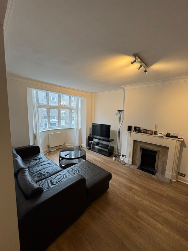 - Bright studio flat with large bay window and open‑plan living / sleeping area