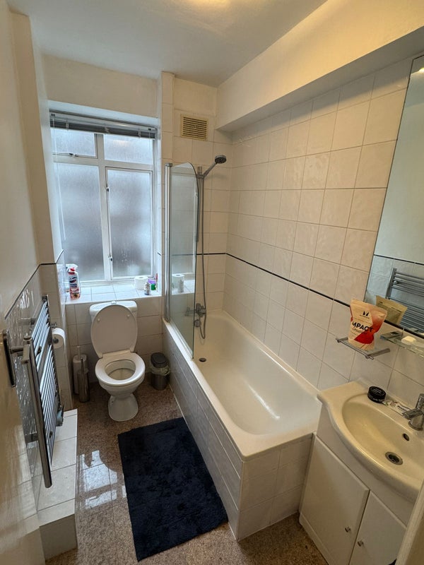 - Good‑size bathroom with full bathtub, over‑bath shower, toilet, and heated towel rail