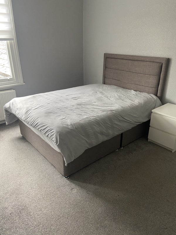 A spacious, light-filled double room available in a professional house share. The room comes fully furnished with a comfortable double bed, large wardrobe, chest of drawers, and a dedicated workspace/desk