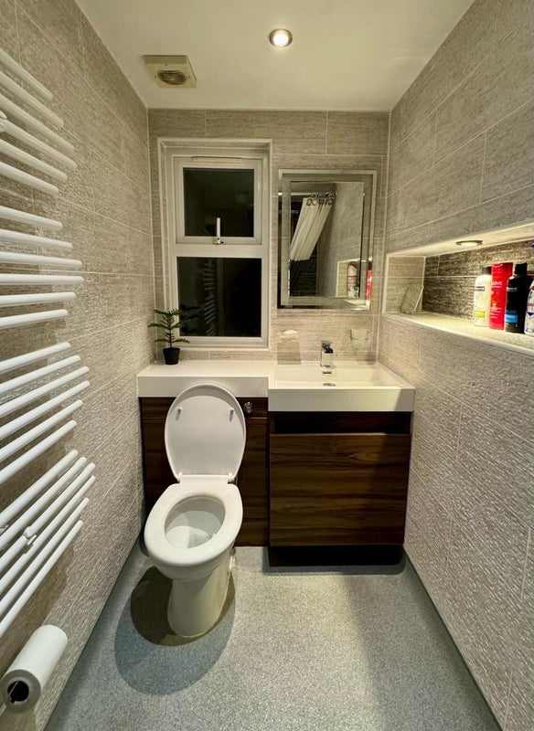 The room is on the top floor of a 3-storey terraced house owned by a Muslim family. It has its own new kitchenette and a shower room which is shared with one other female.