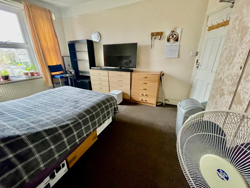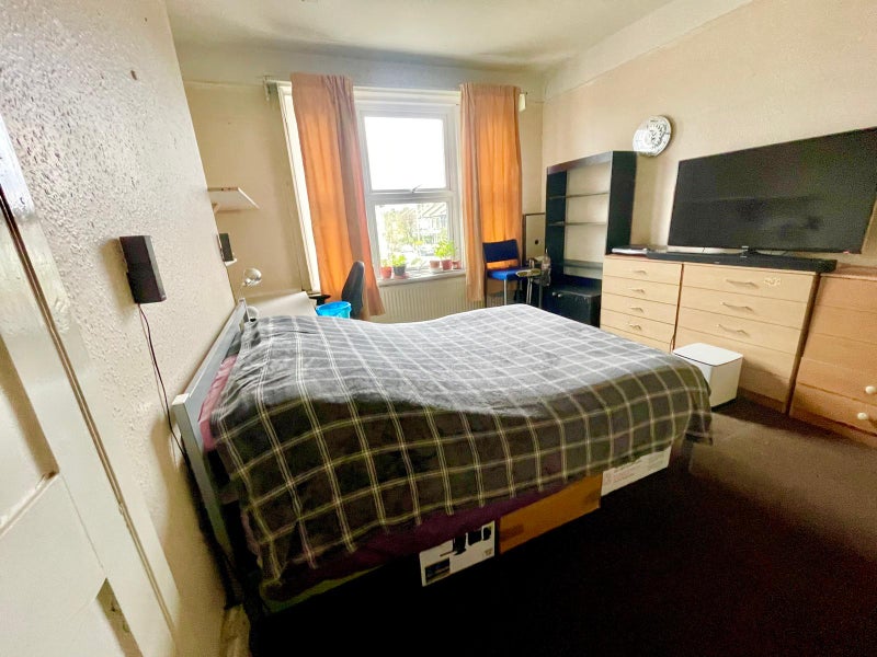 Comfortable double bedroom with bed, wardrobe, drawers, desk & chair – fully furnished and move-in ready