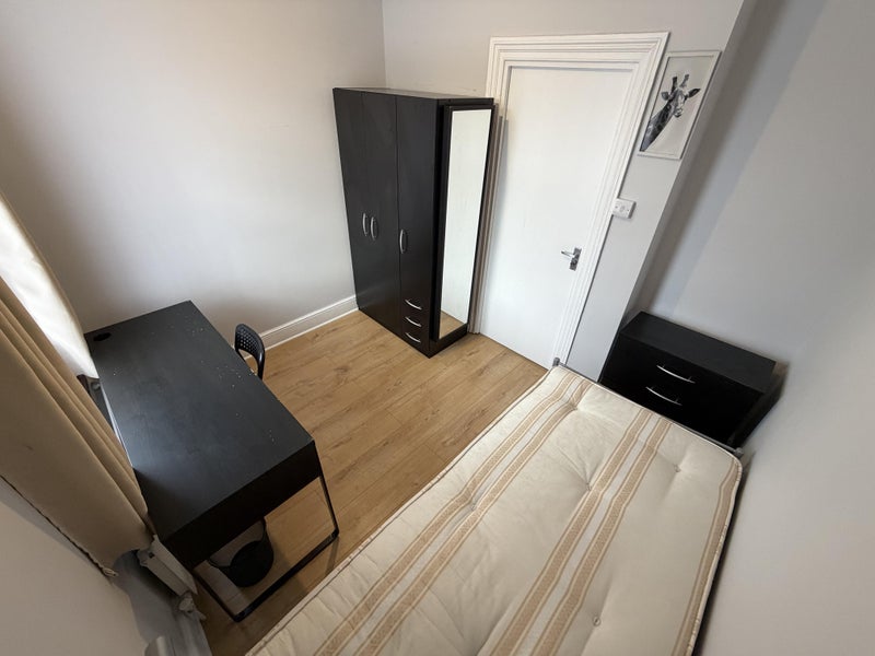 The bedroom has painted walls, laminate flooring and all necessary furniture (bed and mattress, double wardrobe, 4 drawer chest and a full length mirror).