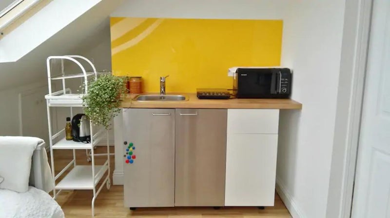 The kitchenette includes a microwave with grill, induction hob, sink, mini fridge, and essential cookware — everything you need for simple, comfortable living. Supermarkets, cafés, restaurants, and other amenities are all within walking distance. Street parking is available with a council permit (not included).