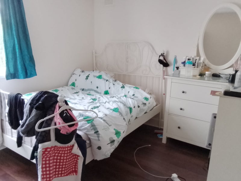 I have a decent sized sunny double bedroom overlooking the garden. Home is only five minutes walk away from the tube station. It is a very clean, neat and tidy home The flat comes with all mod cons in the kitchen including washer / dryer, fridge / freezer, air fryer, food processor etc. The bathroom is a shower bath combo. Bedroom has double bed, drawers with mirror and clothes rail. Garden is huge and a nice place for a cocktail in the summer. The place itself is very homely in a nice road with lots of families. I have security cameras as well as professional locks. The bedroom has lock on the door.