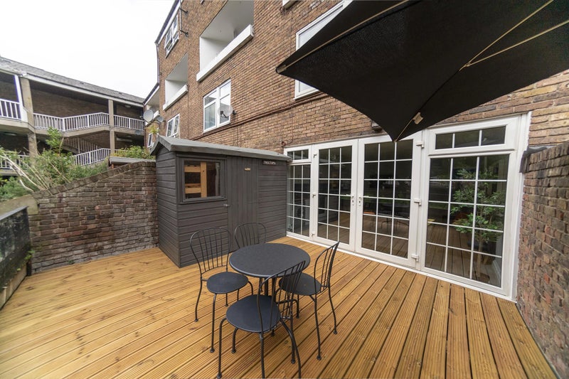 The flat features a bright open-plan kitchen, lounge, and dining area with direct access to a decked garden – perfect for relaxing or socialising. A bathroom and separate toilet add convenience. Modern appliances include a washer-dryer, dishwasher, microwave, oven & hob, and fridge-freezer. Communal areas benefit from fortnightly courtesy cleaning.