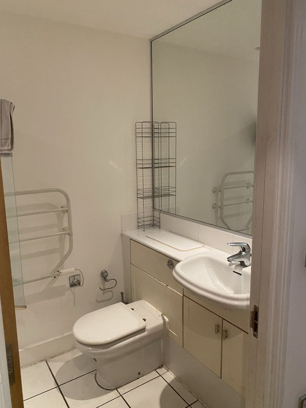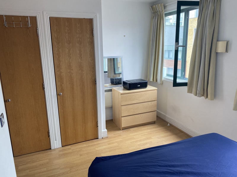 The flat is slightly dated but is huge and the room is large with built in wardrobes with lots of space and two big windows so very light and airy. You can (just about) see Tower Bridge from the room. The kitchen has the usual, oven, washer/dryer, microwave, dishwasher and large fridge freezer. There is your own bathroom with bath which is a great size with a huge wall mirror.