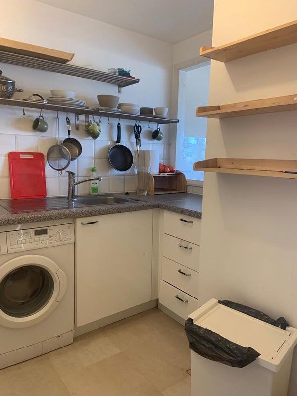 Separate kitchen with dishwasher, washing machine, dryer, fridge/freezer, microwave, toaster and kettle.