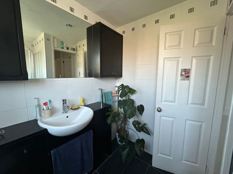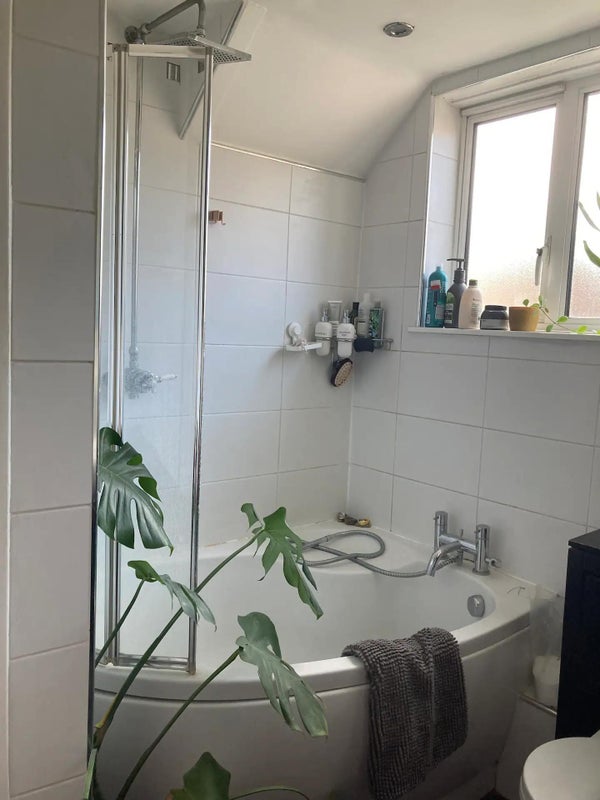 The shared bathroom is well-maintained and clean, with a few lovely plants!
