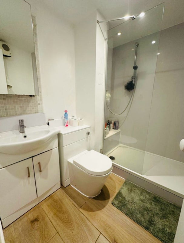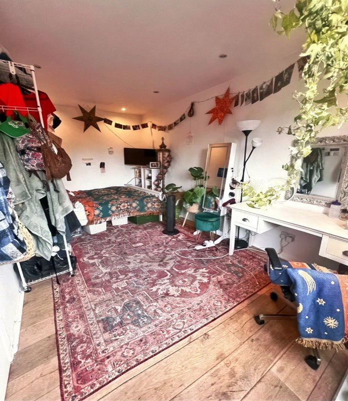 It’s a spacious double with a desk and plenty of storage. The flat has an open-plan living area, great WIFI, river and city views, TV, and parking.