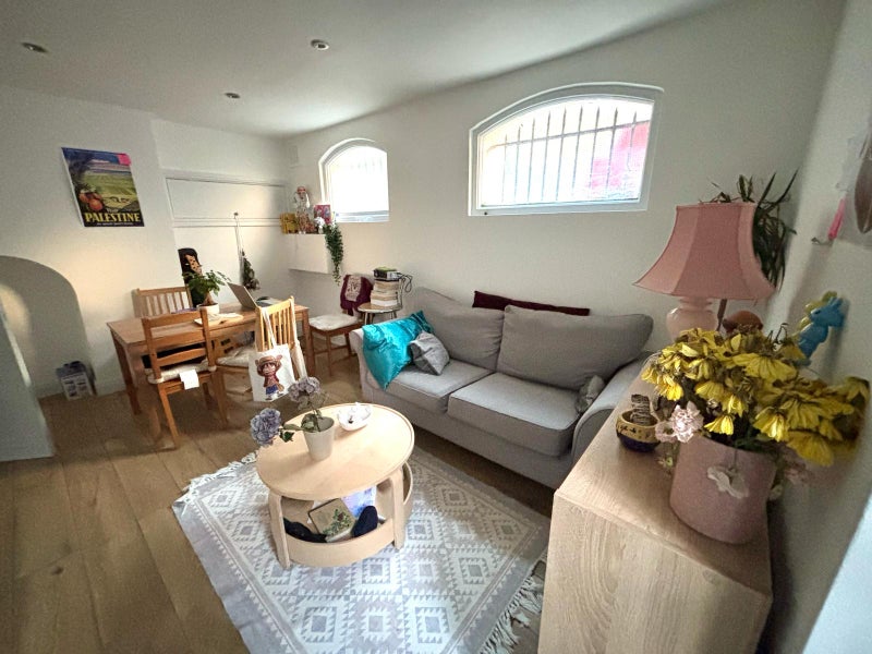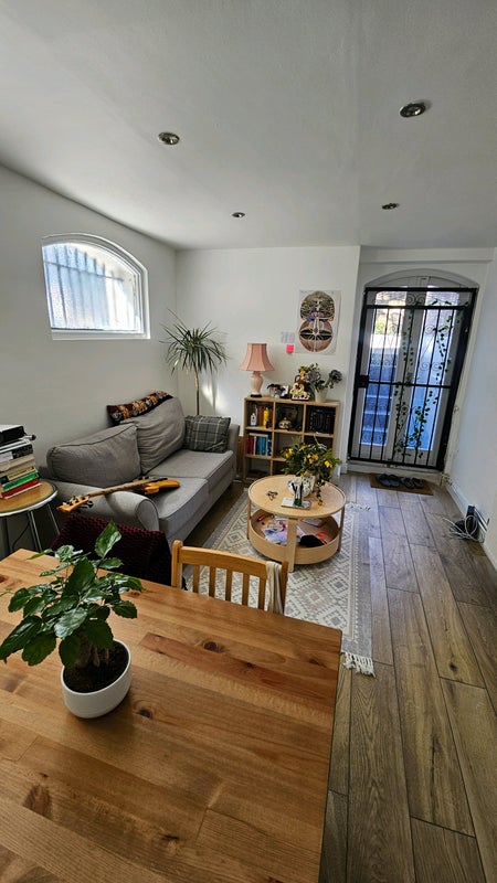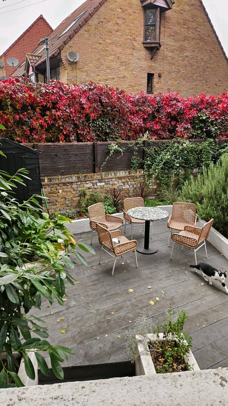 The flat is very homely, I furnished it myself. It's two levels with a big living room, kitchen, a beautiful private garden, two single bedrooms, and a toilet.