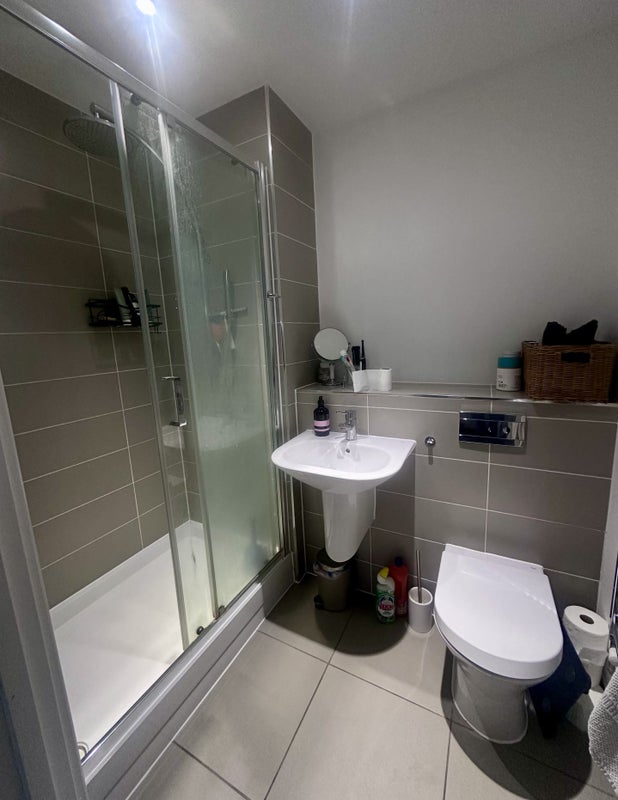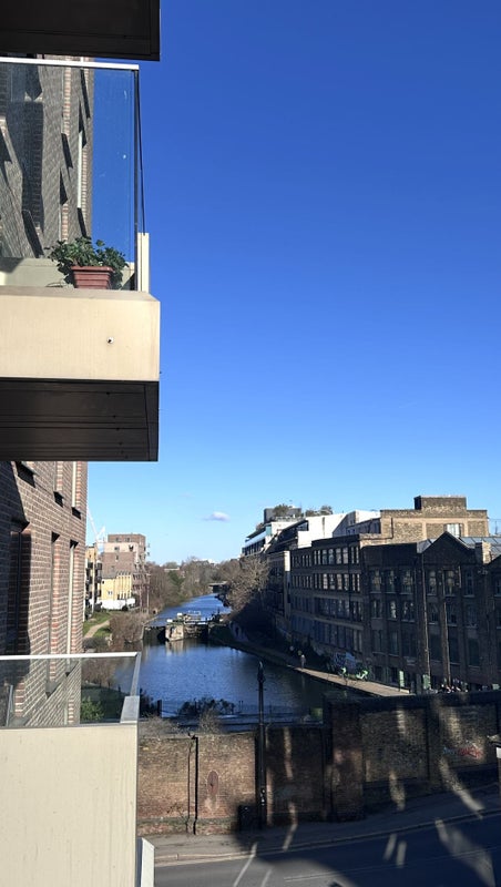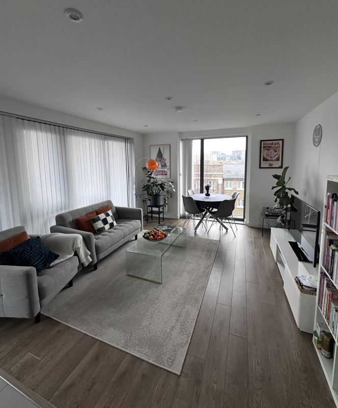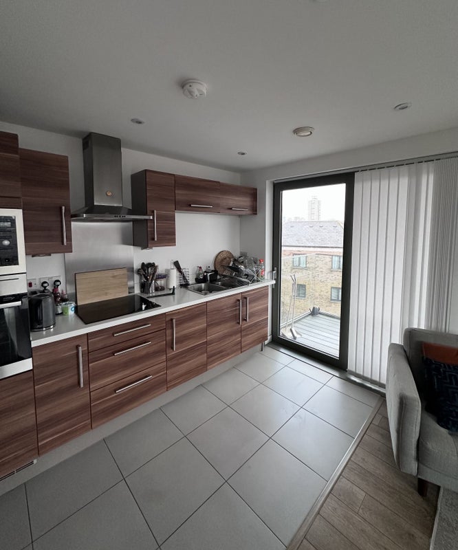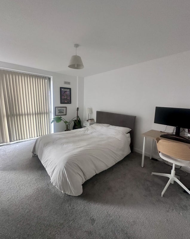 The room is in a two-bedroom, modern flat with canal views, located between Mile End and Limehouse stations (10 min walk each). It's a spacious en-suite with storage.