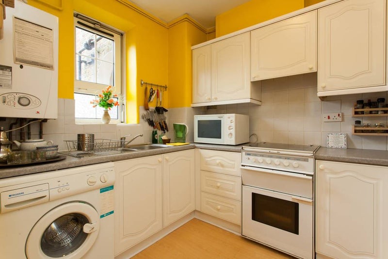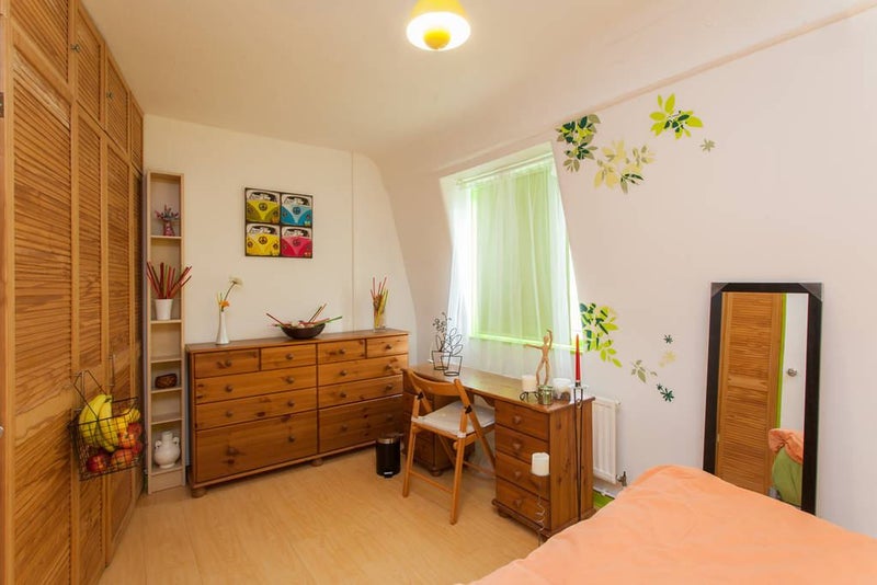 The stunning apartment has been newly refurbished and elegantly decorated to a high standard, with a beautiful arrangement of warm, contrasting colours. The spacious spare bedroom is bright, welcoming and cosy thanks to its wooden furniture, which offers generous storage space. The large window looks onto the communal garden, making your room a quiet and peaceful abode.