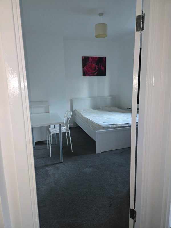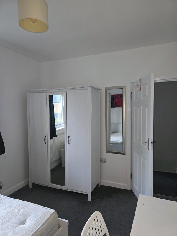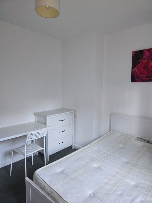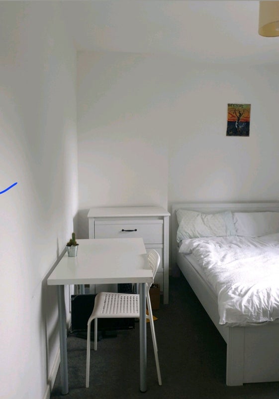 A reasonably large house with lots of space. There is a living room, a kitchen and one bathroom. The room available to rent is large, with a wardrobe, it's a double bed and bedside draw - is also has a desk.