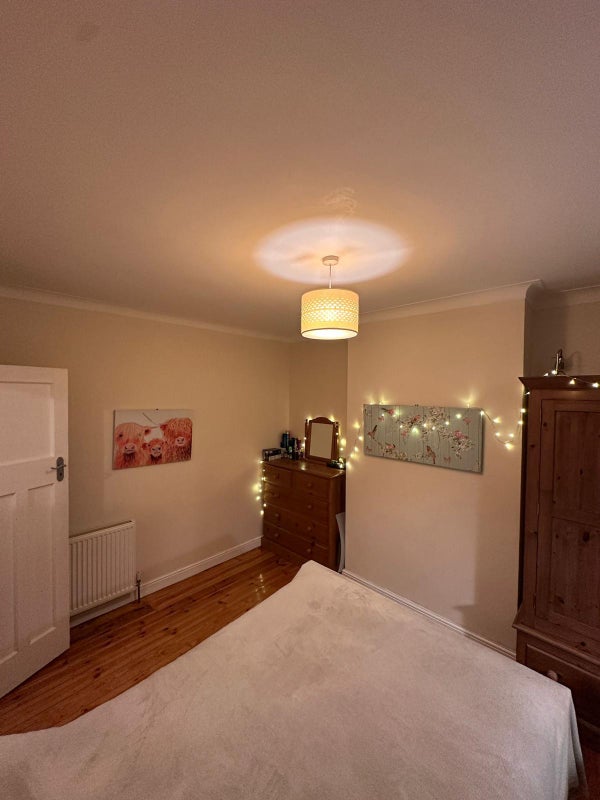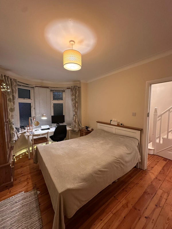 A bright, spacious ground floor double with a large bay window overlooking the front garden (1st bedroom in the video clip). Fully furnished with a solid timber-frame bed, large wardrobe, bedside table, chest of drawers, and dresser. Cosy, characterful, and very well looked after.