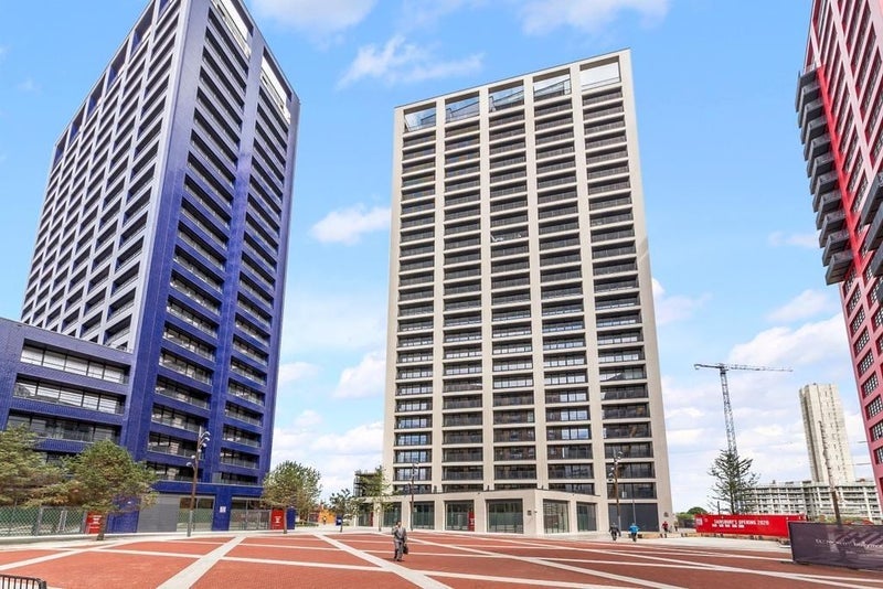 The open-plan living and dining area is generous in proportion, filled with natural light through large windows and finished in a sleek, neutral palette that is both stylish and immediately liveable. Step outside onto the private balcony to take in views across the square and directly towards the English National Ballet — a genuinely unique outlook in East London.