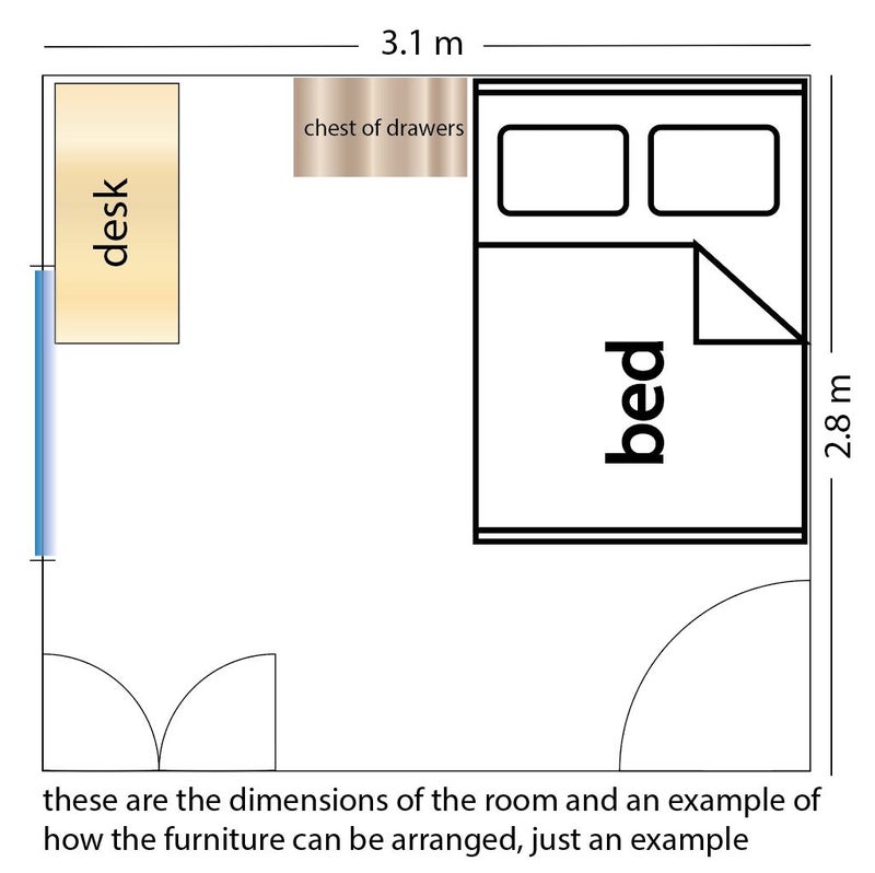 included in the room: double bed, bedside table, chest of drawers, desk, build in wardrobe. other furniture will be provided by request