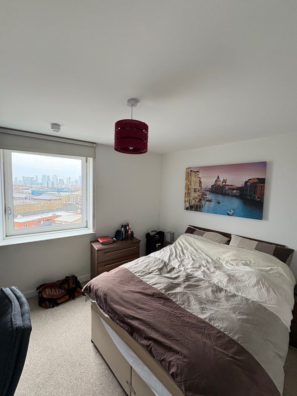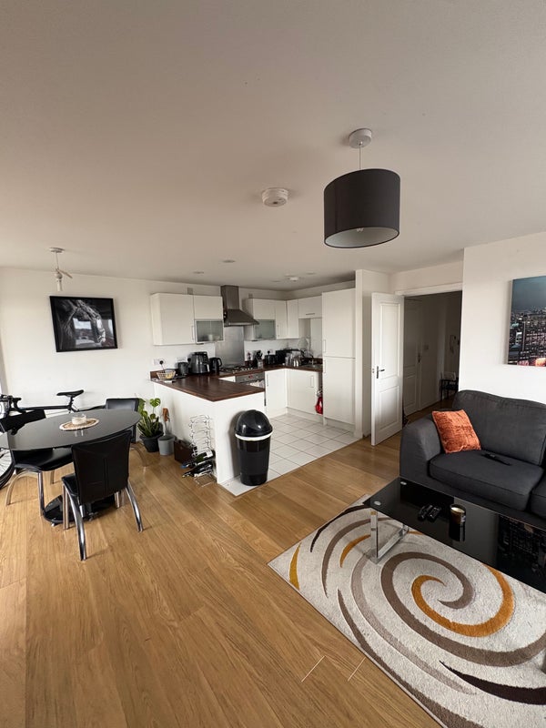 Spacious living area, balcony with great views of London and also access to a communal rooftop garden.