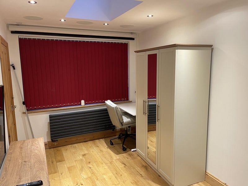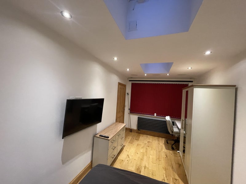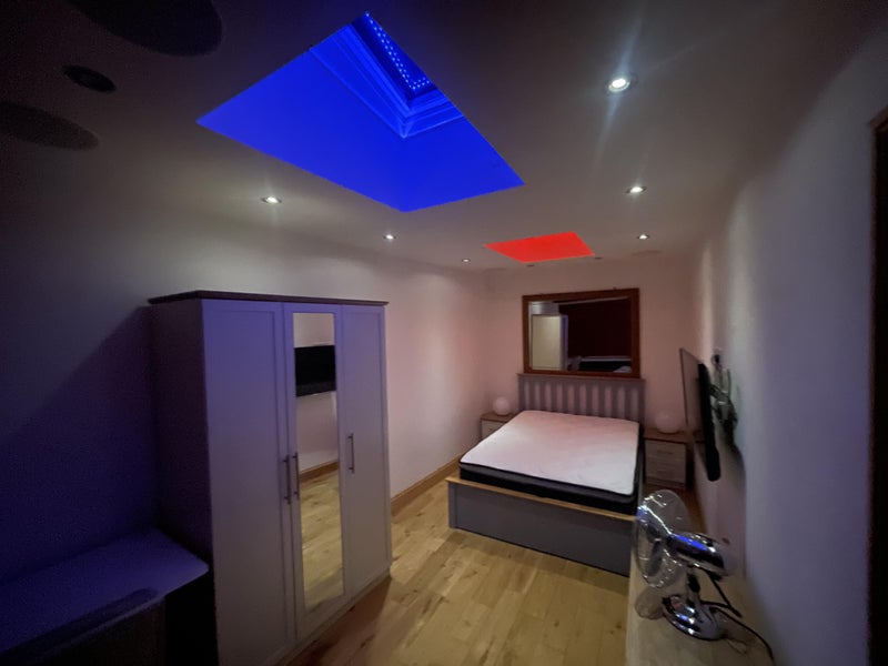 Brand new furnishings / mood lighting, large ottoman bed with loads of storage, Large mirrored wardrobe, Smart TV, Electric sitting or standing office desk & comfortable adjustable chair,
