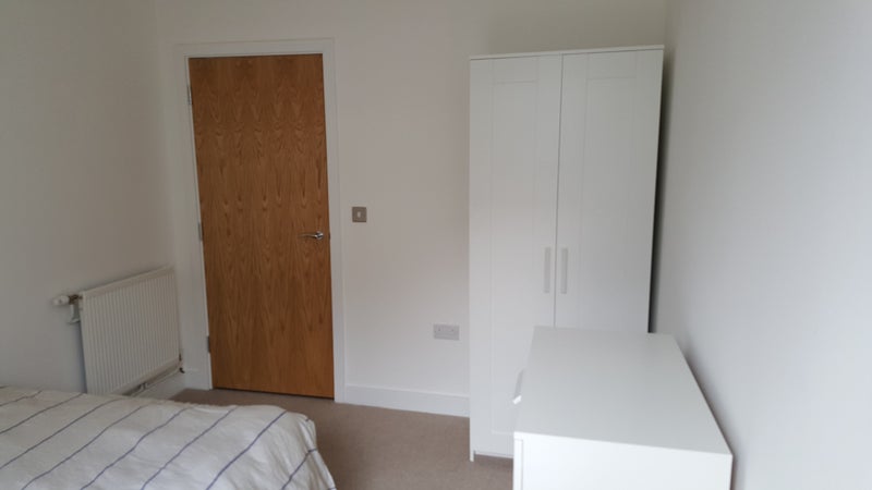 Good-sized room with double-bed, wardrobe, bedside table and chest of drawers.