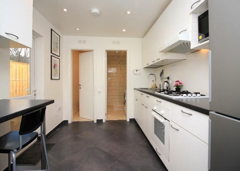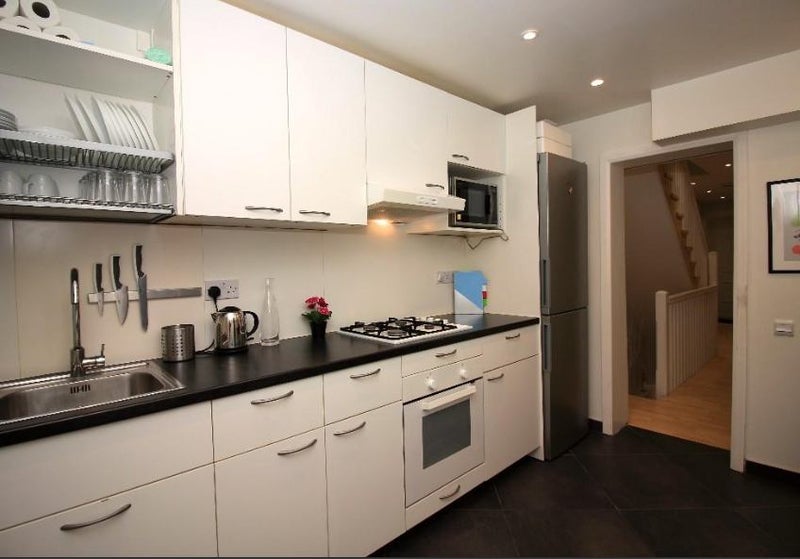 The kitchen appliances include: fridge/freezer, oven, microwave, kettle, toaster and blender.