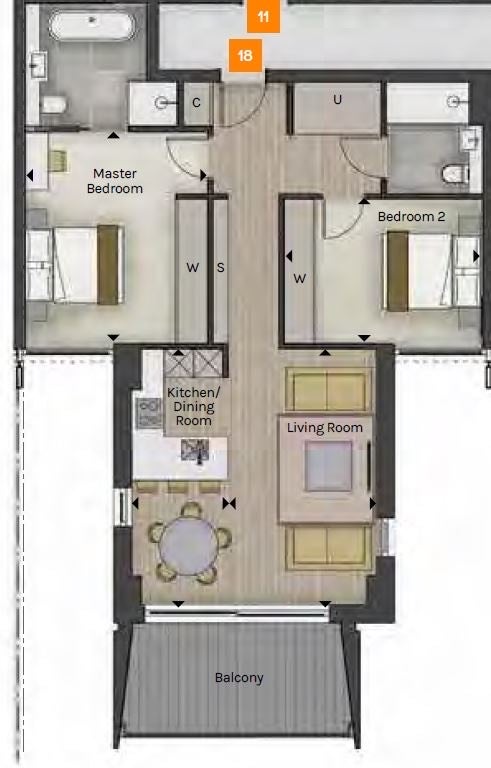 The apartment features an open-plan living and dining area, a sleek modern kitchen with integrated appliances, generous bedrooms with built-in storage, and two luxurious bathrooms including an en-suite. Comfort cooling and underfloor heating ensure year-round climate control, while large windows allow natural light to pour in, enhancing the sense of space and calm.