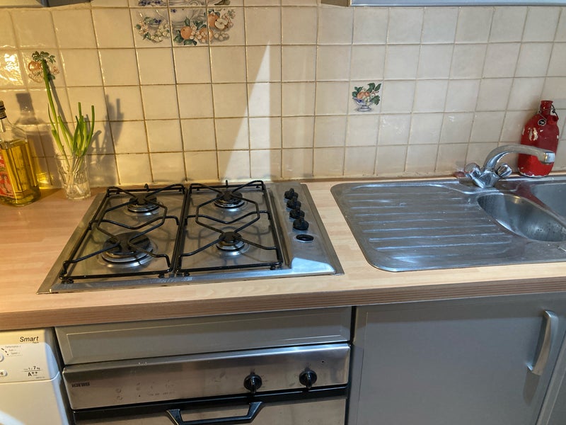 - Four gas burners and a large oven