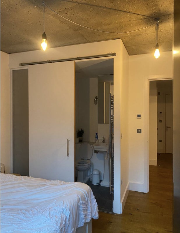 Great double bedroom, large wardrobe space and juliet windows that open onto a quiet street / rooftop view in a warehouse style modern building.