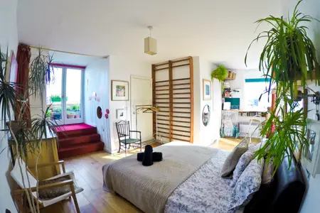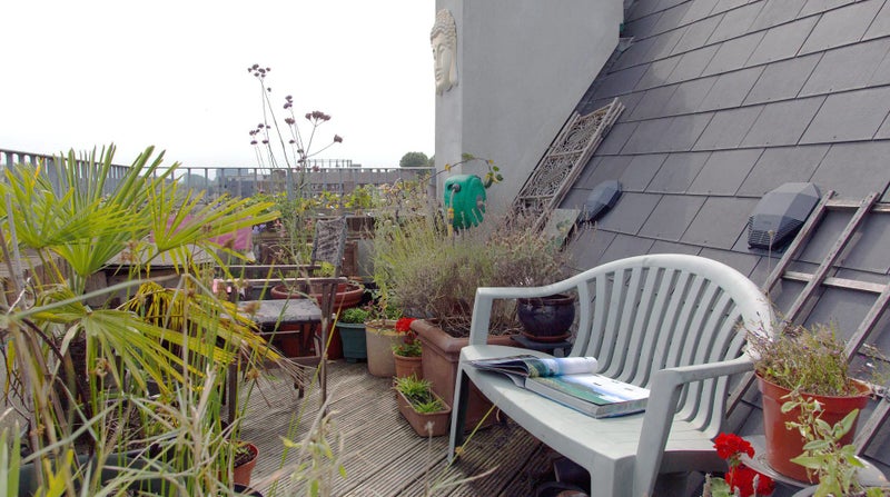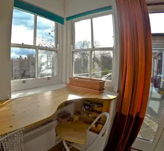 All bills included except electricity. Our light and airy flat has long views south, east and west. It’s the top floor of a converted Victorian schoolhouse, oriented to catch all available sun. Your room faces south and east, with an ensuite bathroom and two sets of double doors leading to your own private terrace, and the shared terrace too.