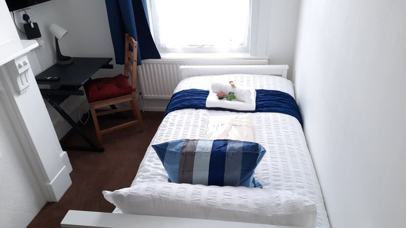It has one bed with comfortable mattress, a wall TV, a computer desk with chair. Virgin broadband access.