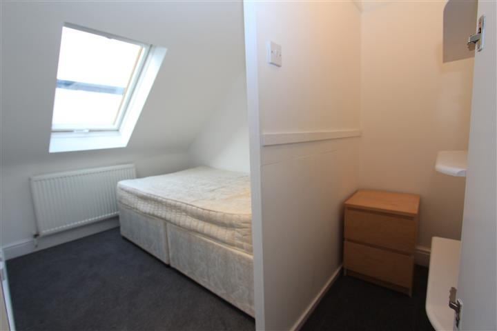 Double bed and headboard, spotlights, 3 double sockets, TV and telephone points, wall mirror, birch 2 drawer unit, Velux window and beige blackout blind, walk-in wardrobe (4.4 x 2.10 – H: 6.10) with light, rail and shelves.