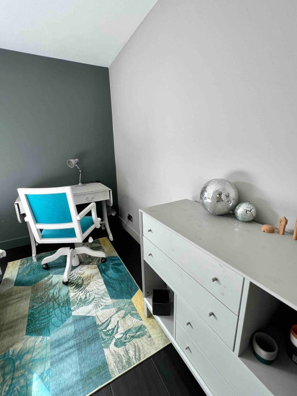 The room also offers desk & chair + a chest of drawers.