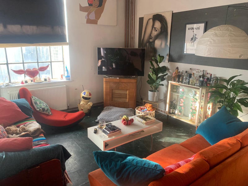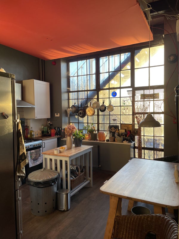 The warehouse has HUGE windows along every wall which means it is constantly filled with great light and is a happy place to be. We have a large kitchen, one bathroom with a bath (unfortunately no shower), a huge living room/dining room.