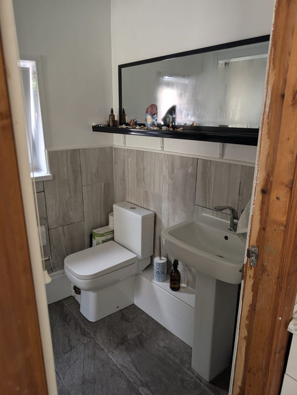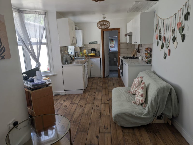 The room is large - easily fits a double bed, desk, large wardrobe and still feels spacious. The room would be unfurnished apart from the wardrobe. There is a shared living room/kitchen that comfortably fits two, a shared bathroom and we have a lovely private patio and covered porch.