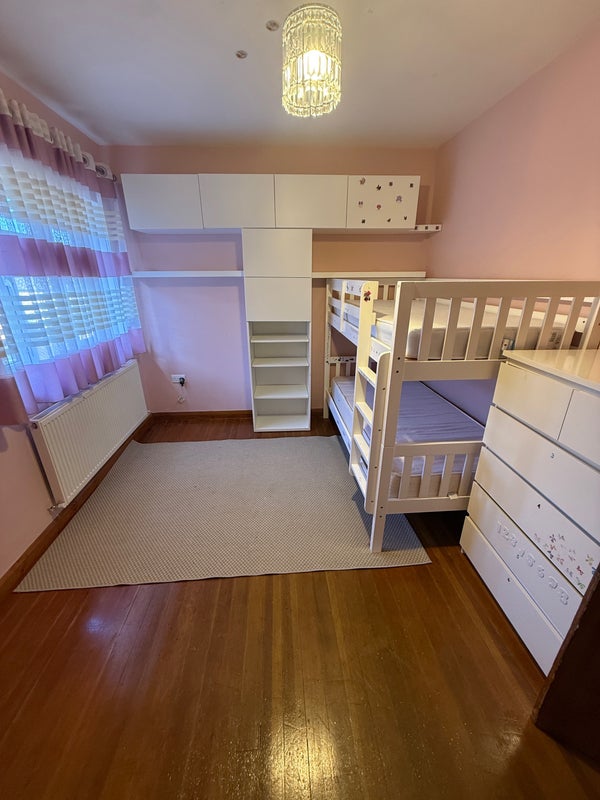 The flat features four generously sized bedrooms, a modern bathroom, and a fully fitted kitchen with ample storage and dining space. Natural light flows throughout the property, enhancing the sense of space and creating a welcoming atmosphere.