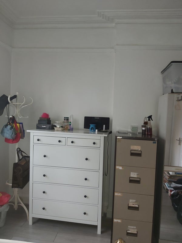 Located on the ground floor and includes a double bed with under-bed storage, wardrobe, large chest of drawers and small bed-side chest of drawers. The room is within a flat shared with two other people. Other benefits include :-