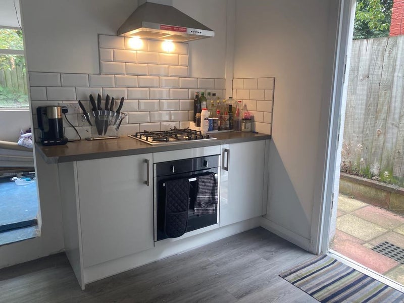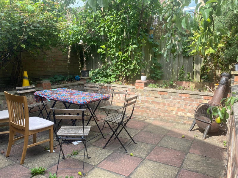 The room is in a terraced house on a quiet residential street. You'll share (with the 3 current housemates) a large living room with TV, dining room with lots of storage, fully equipped kitchen with fridge and freezer space, bathroom (with bath and overhead shower), a utility room with a washing machine. We have a paved backyard with plant beds to grow some veg and a chiminea and bbq. We also have access to a pear tree and a rosemary bush!