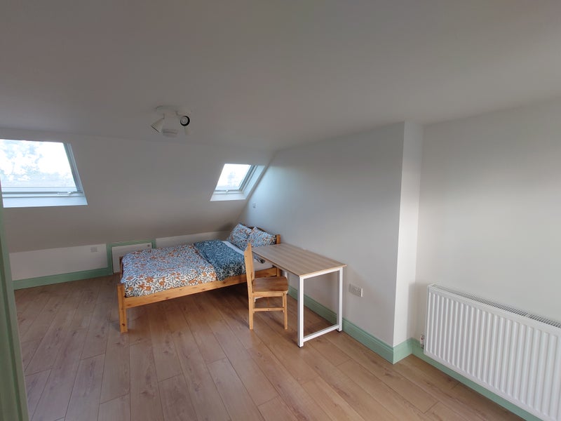 Your room is a very large loft room with all-day sunlight, let furnished. It's next to a brand new bathroom, which isn't en-suite, but of which you'll be the main user (I use the one downstairs).