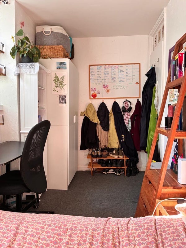 The room is small but cute, cosy and clean. It has a double bed, desk, wardrobe and under-bed storage.