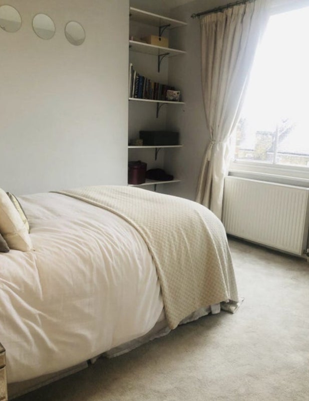 Quiet sunny, double room with high ceilings, super-comfortable bed, modern furniture, lined blackout curtains, and great storage.