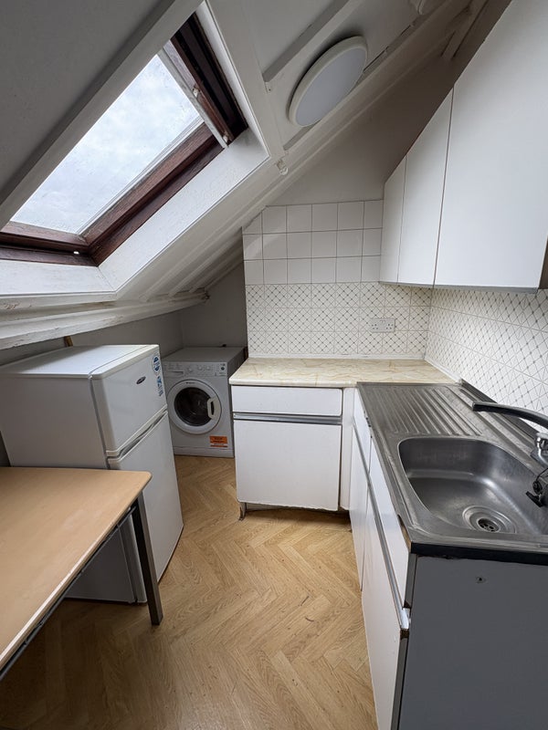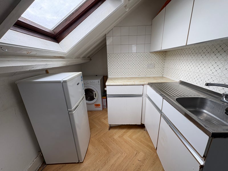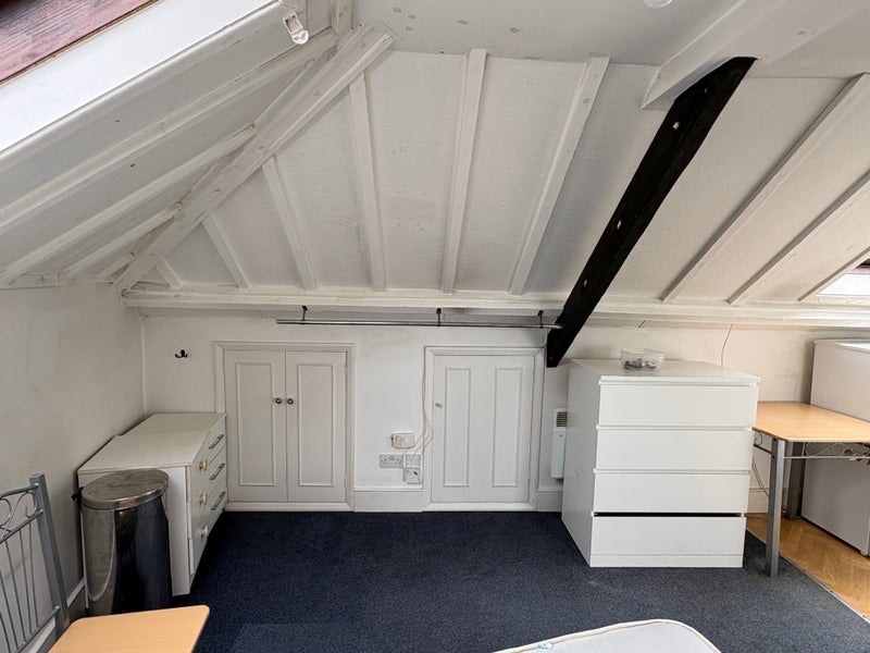 The large loft-conversion studio comes with double bed, full kitchen (including a washing machine), and large bathroom. Located on 2nd floor.