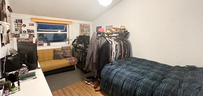 Furniture included in the room: double bed, a desk, a chair, two sets of draws, a set of share shelves, clothes rail.