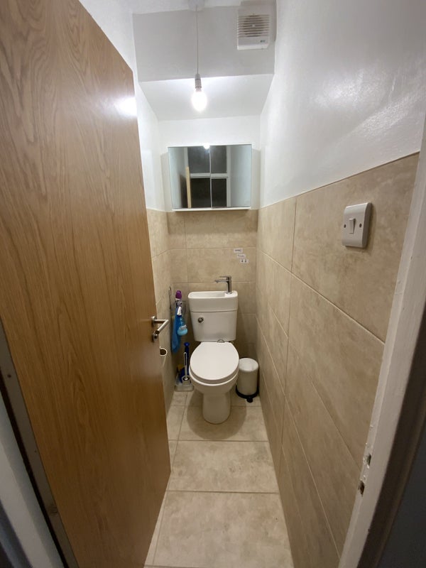 One double shower cubicle and hand basin in tiled bathroom and a separate toilet room with a hand basin.