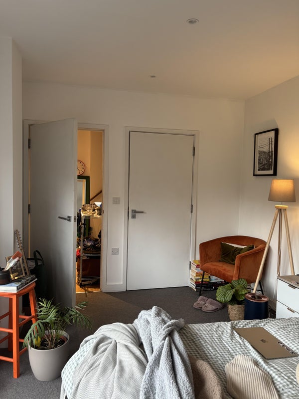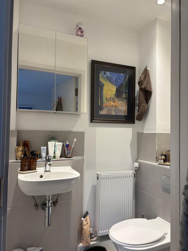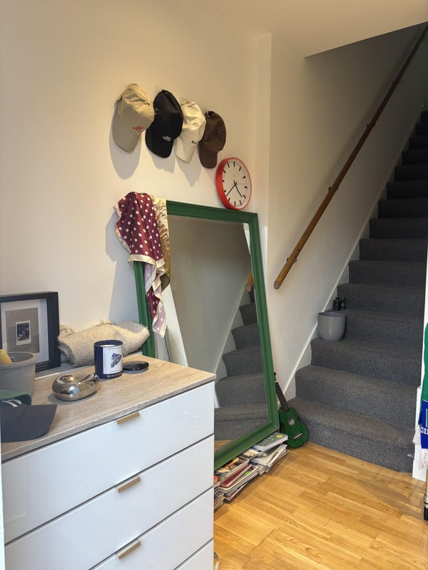 This room is great for someone who likes a bit of privacy, lot's of light and a good amount of space. It is furnished with a double bed and bed side tables and its own bathroom with toilet and sink. The flat has three levels. This bedroom is on the lowest ground level and has its own hallway, chest of drawers and wardrobe as well as an external door which you can use to come and go as you please. There is a separate front door upstairs which everyone uses.